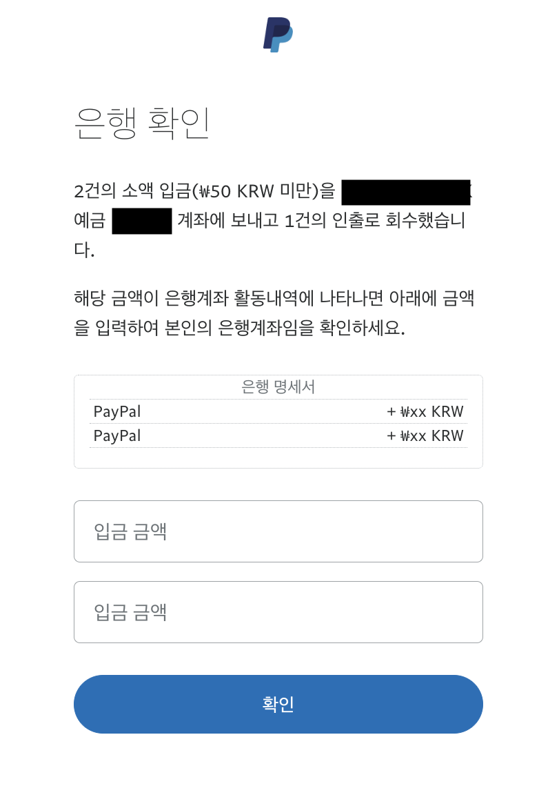 여기서 페이팔에서 입금/출금 금액을 입력하면 은행계좌 등록이 완료 됩니다.