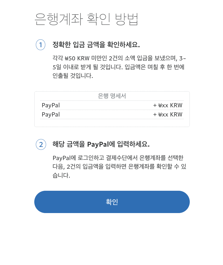 은행계좌 확인 방법이 화면에 나타납니다. 이 확인 방법은 페이팔에서 3~5일 이내로 아까 입력한 계좌에 입금하고 출력을 한다는 것이고,