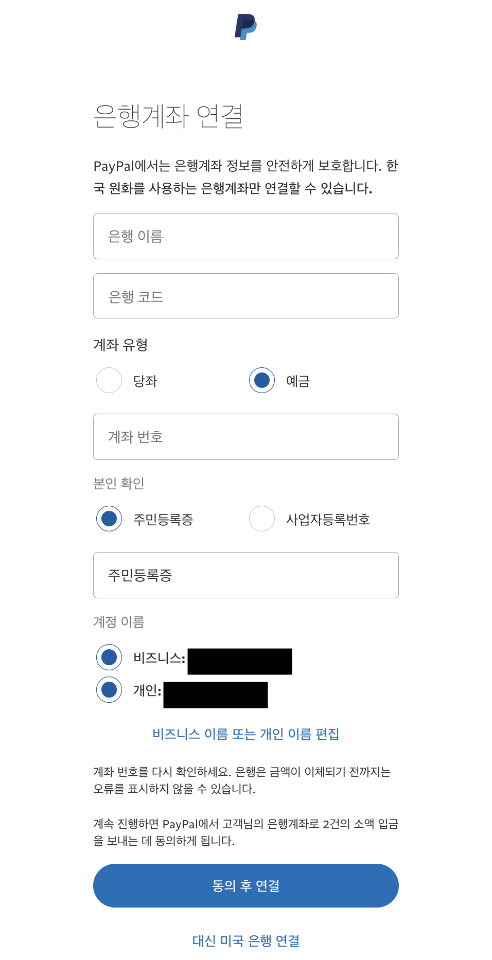 - 검은색으로 가린 부분은 이전에 입력한 기본정보와 비즈니스정보의 이름입니다.