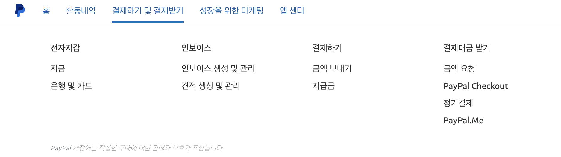 페이팔에 로그인하고 상단의 메뉴중 결제하기 및 결제 받기를 클릭합니다.